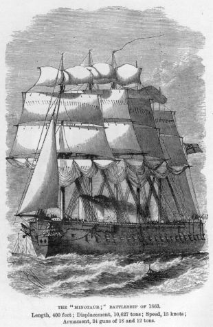 In 1861, ships of the type of the Minotaur were built, armoured from stem to stern. These were considered monster ships at the time, as they had a displacement of, 10,627 tons and were 400 feet in length. Their speed was 14 or 15 knots, attained by engines of 6,700 horse-power. The bow was constructed on the ram principle, projecting some distance under the water, and her sides were covered with iron plates 5 inches thick, tapering off in thickness, however, as they approached the bow. Further, she was divided into many compartments below water, with watertight doors, so that if pierced, either in action or by grounding, she might still be kept afloat. She was fitted with five masts, made partly of iron, while her armament consisted of thirty-four 12-ton and
