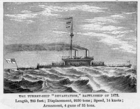 Turret-ships, as first constructed, were very heavily, armoured, and in consequence rather unseaworthy. Being intended for coast defence only, they always had a harbour available in bad weather, and sails were not required as they were never far from a coal supply.