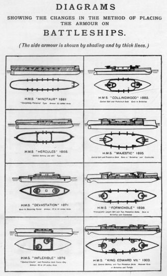 The result of these improvements was to some extent a repetition of what had taken place when rifled guns were first introduced. Guns could be made lighter, and yet be much more powerful than the old patterns of the same bore, and it was seen that a ship could with advantage be provided with a “secondary” armament, as it is called of these smaller yet powerful guns. Armour, too, was being improved, so that it could be made thinner and yet equally effective; higher speeds were also called for, and it was evident that warships must be designed on different lines to meet or take advantage of the new conditions.